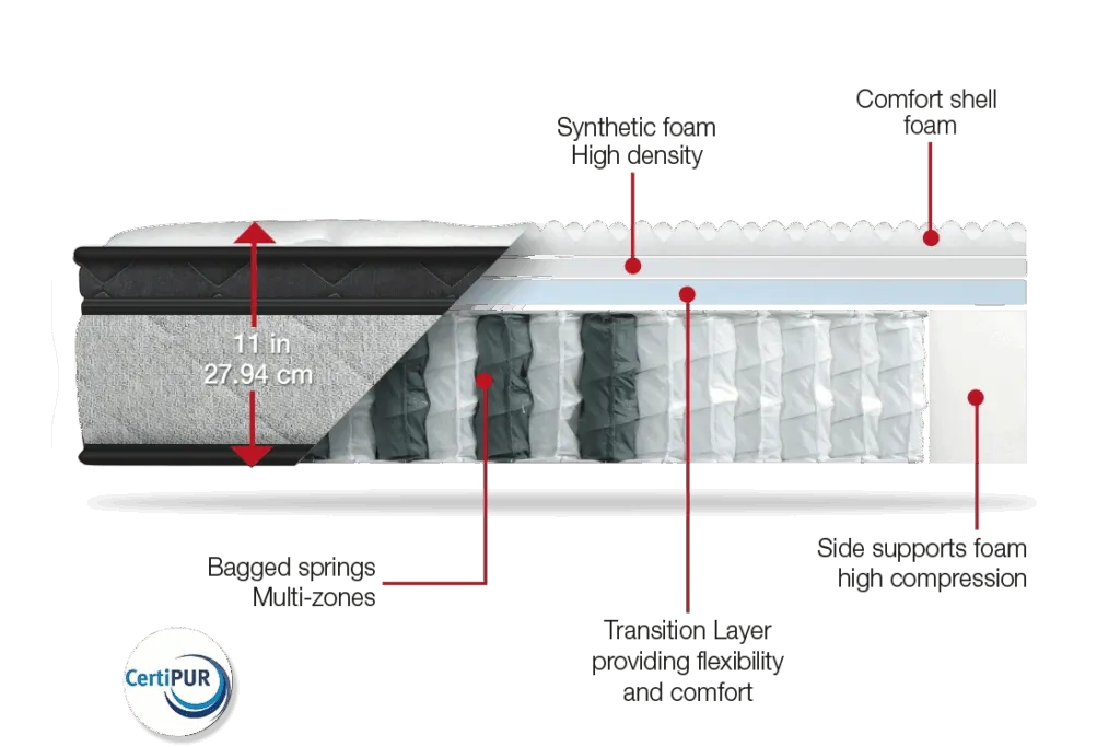 The Ergopedic mattress boasts a cutting-edge design, featuring individually encased pocketed coils that contour to your body’s unique shape. Il providing unparalleled support and motion isolation. With high-density foam side supports that cover 100% of the mattress’s perimeter. You’ll experience enhanced edge-to-edge stability, preventing sagging and increasing usable sleep surface.