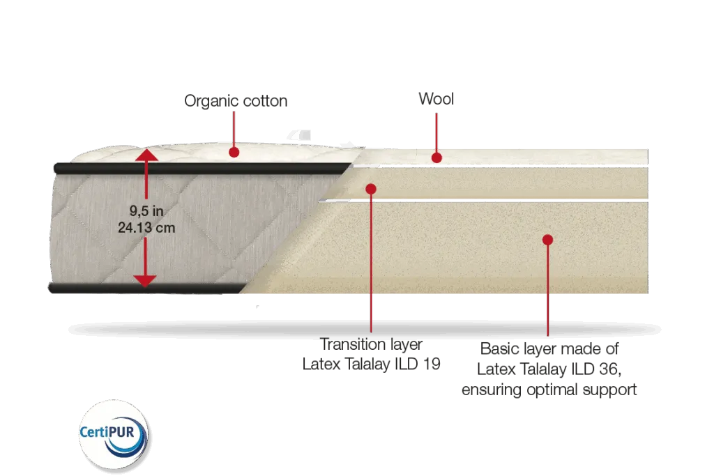 The eco-friendly latex is natural, hypoallergenic, and offers exceptional temperature regulation. Its resilience makes it durable, while Joma Wool® enhances comfort and helps maintain optimal temperature. Our GOTS-certified organic cotton is environmentally friendly and non-toxic.