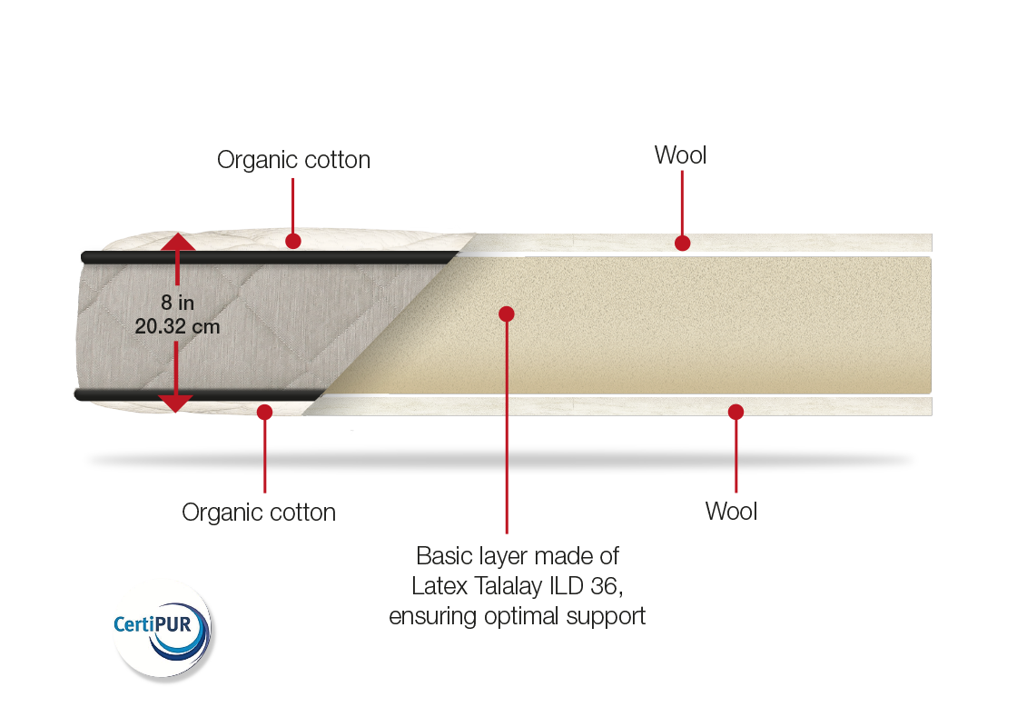 Initially crafted from Talalay eco latex, wool, and wrapped in luxurious organic cotton fabric, this mattress embodies peak durability and comfort. The eco-friendly latex, 100% natural, biodegradable, and renewable, offers exceptional benefits. Its support is specifically designed to contour to every inch of your body, providing an optimal response to all your physiological needs.