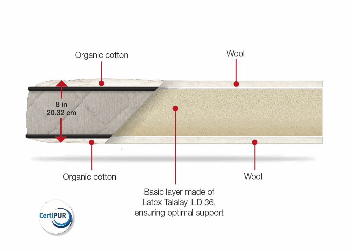 First crafted from eco-friendly Talalay latex, wool, and wrapped in luxurious organic cotton fabric, this mattress embodies durability and comfort at their peak.Ecological latex, 100% natural, biodegradable and renewable, offers exceptional benefits.