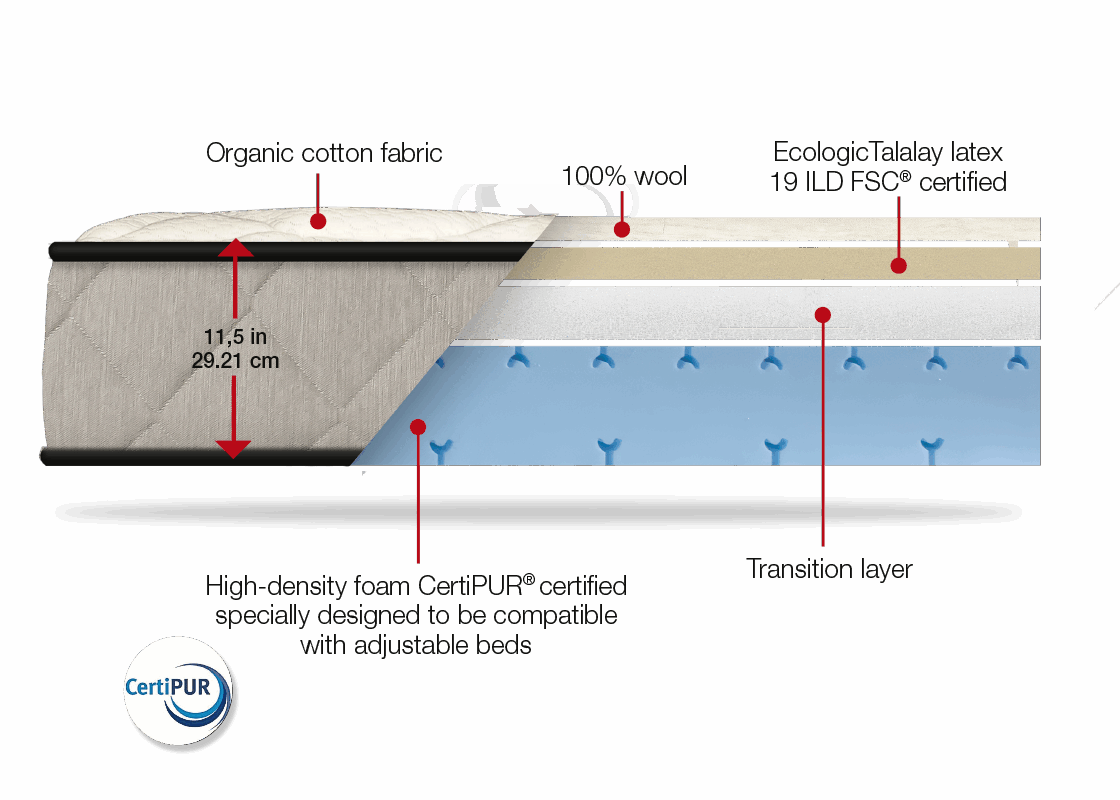 The Latex Hevea mattress also features the inclusion of wool, renowned for its natural temperature-regulating properties. Experience the warmth you crave in winter and the coolness you desire in summer, ensuring peaceful nights year-round. Our wool is organically certified, reflecting our unwavering commitment to sustainability.
