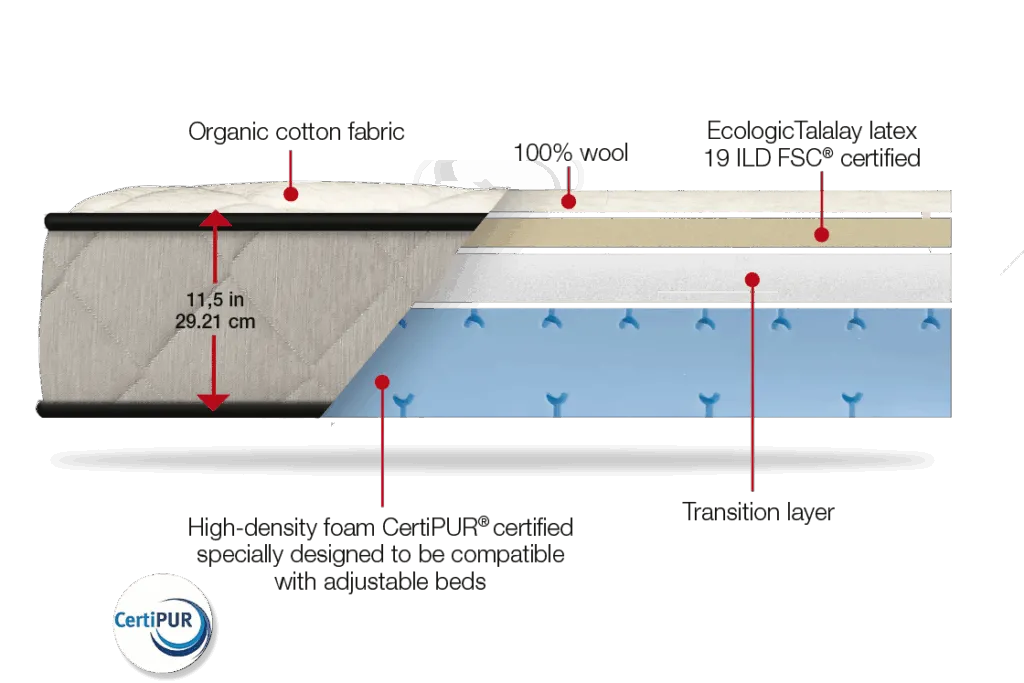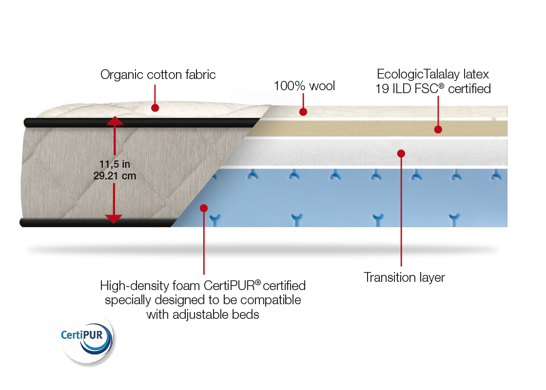 For ultimate comfort, we have added a layer of soft, luxurious organic cotton that wraps around the latex. By choosing organic cotton, you not only enjoy a pleasant, tactile sensation, but you also contribute to environmental preservation, helping to reduce our carbon footprint.