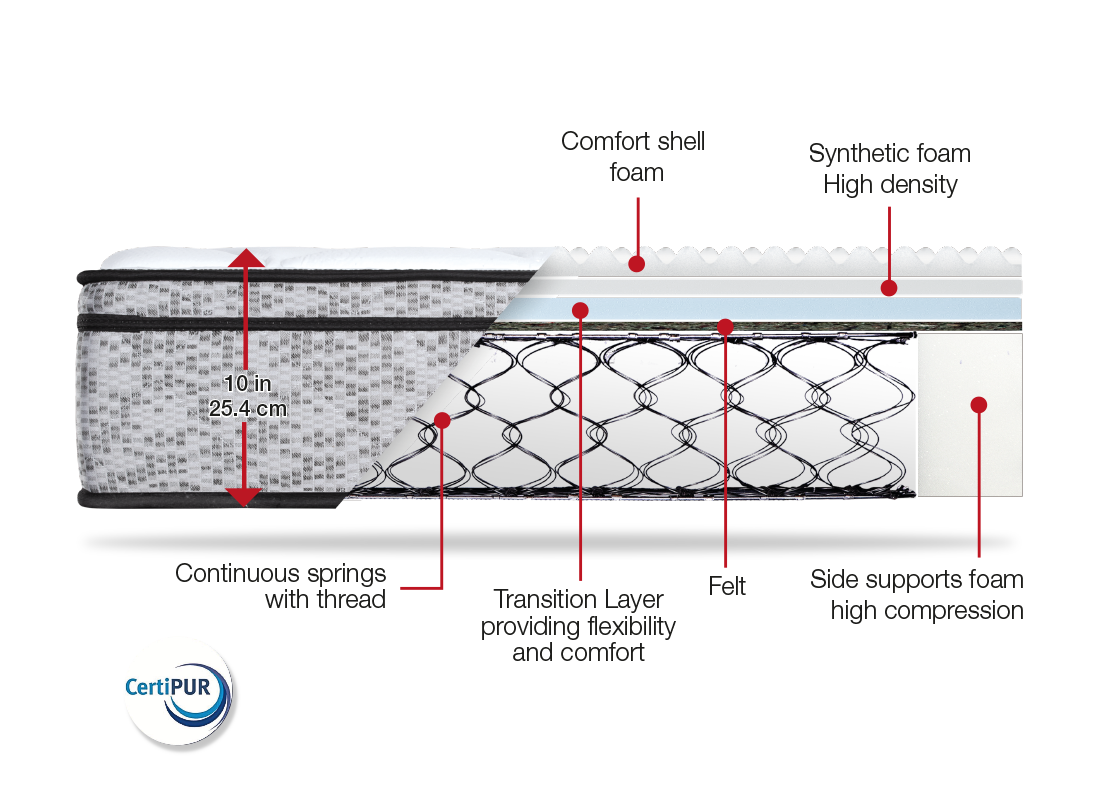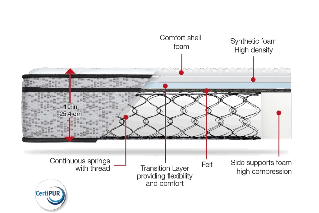 Our medium-firm mattress with continuous springs is designed to meet your unique sleep needs. The high-compression foam edge supports, distributed around 100% of the perimeter, provide unwavering stability. You won’t experience any loss of support, even at the edges of the mattress.