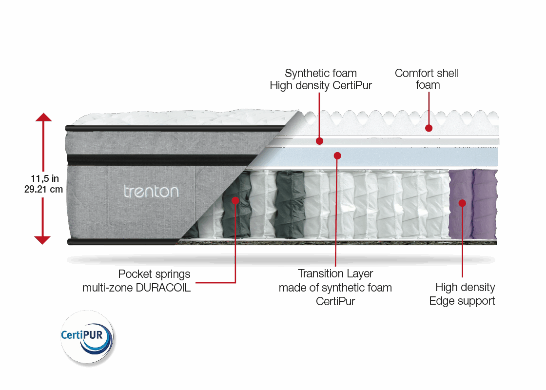 The Trenton ( Firm ) Hybrid Mattress lies in the integrated contour reinforcement, which maintains the stability of the mattress and extends its durability. You will benefit from exceptional support for your back, shoulders and hips, thus reducing back pain and promoting a healthy posture during sleep.