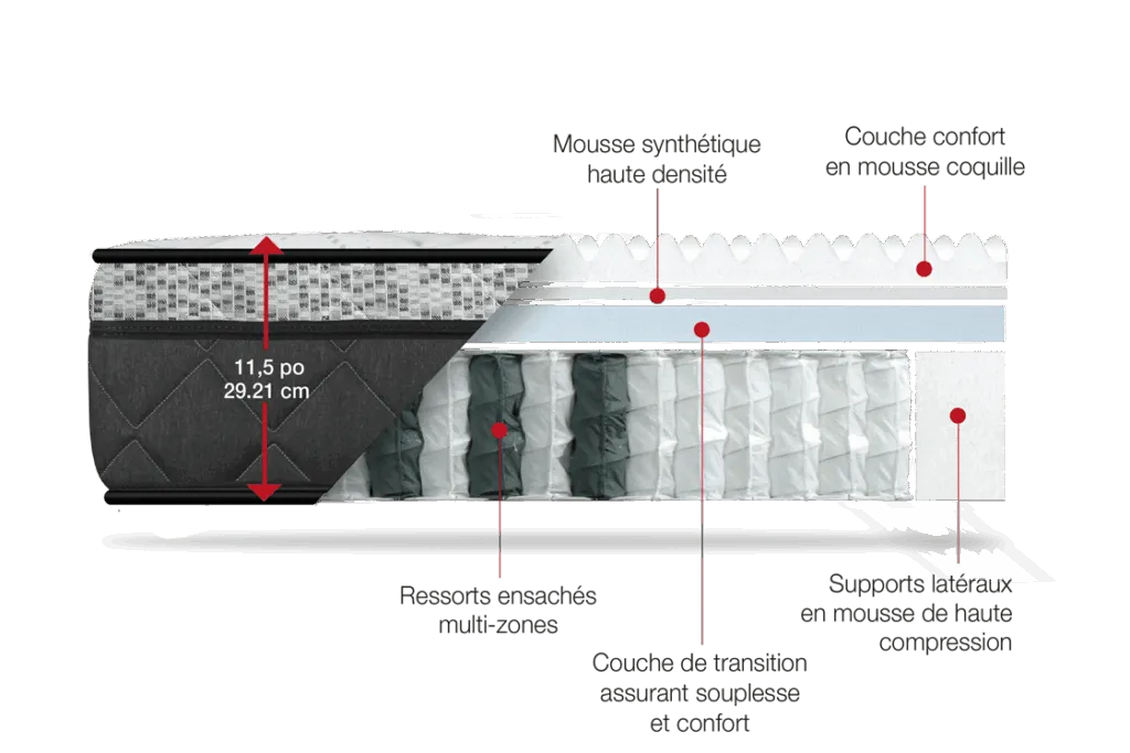Vos clients dirons adieu aux nuits agitées et aux maux de dos, et plongerons dans un monde de repos absolu. Profitez des bienfaits d’un soutien ciblé, grâce aux zones différenciées qui s’adaptent à la morphologie de votre corps. Grâce à notre Matelas Ambiance , vous vivrez chaque nuit comme une expérience digne d’un hôtel 5 étoiles.