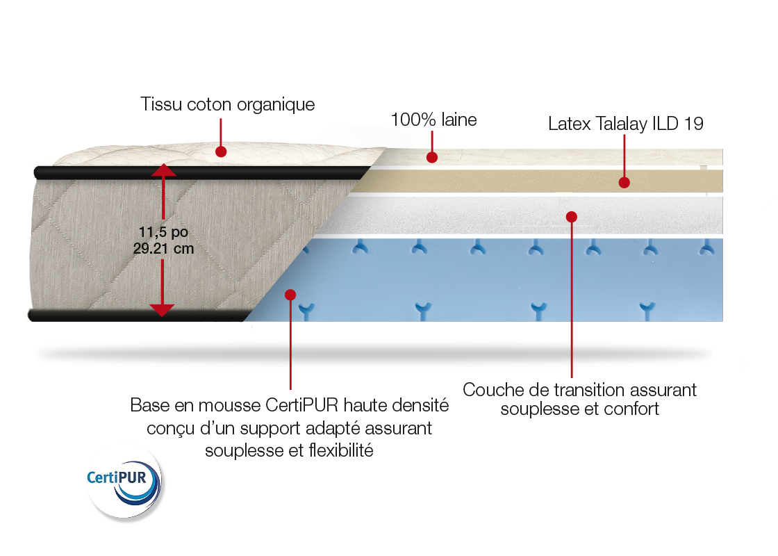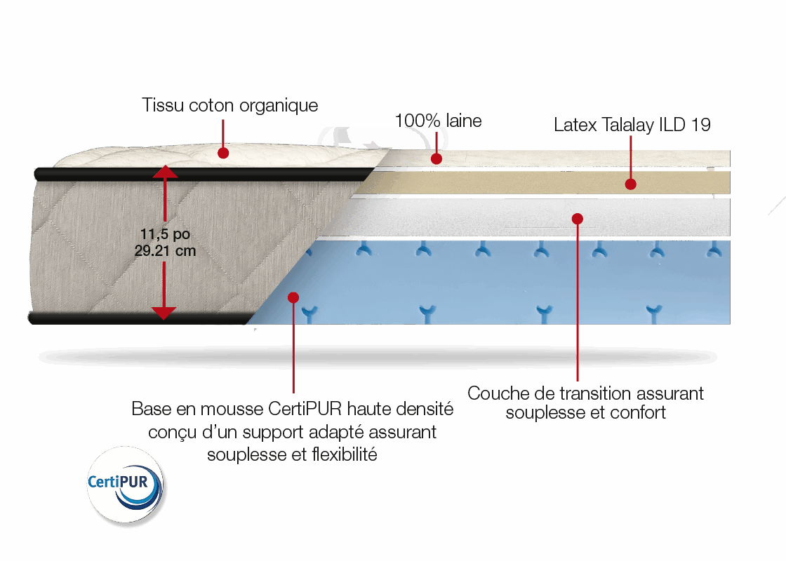 Pour un confort ultime, nous avons ajouté une couche de coton organique, doux et luxueux, qui enveloppe le latex. En choisissant le coton organique, non seulement vous bénéficiez d’une sensation agréable au toucher, mais vous participez également à la préservation de l’environnement, contribuant ainsi à réduire notre empreinte carbone.